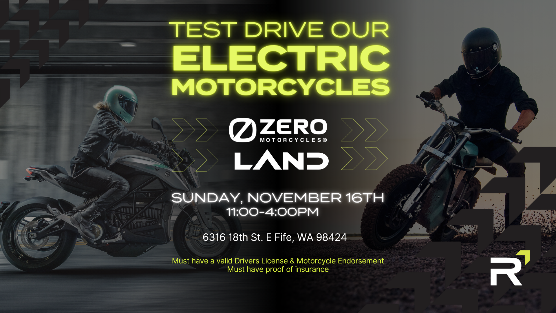 Come experience the future of two-wheel mobility at our Range Ride & Drive event in Fife. Test ride electric motorcycles from Zero Motorcycles and Land Moto, with 8 models to choose from — including dual sports, street cruisers, and EV dirt bikes.